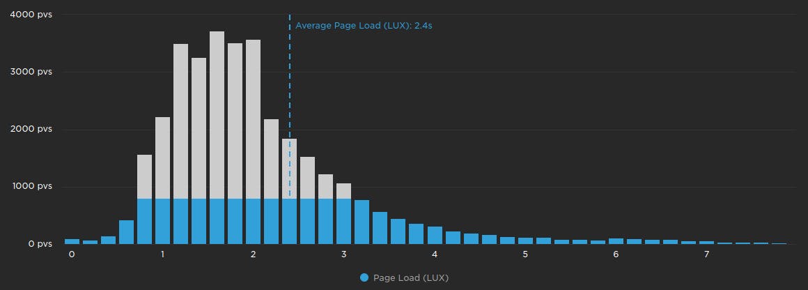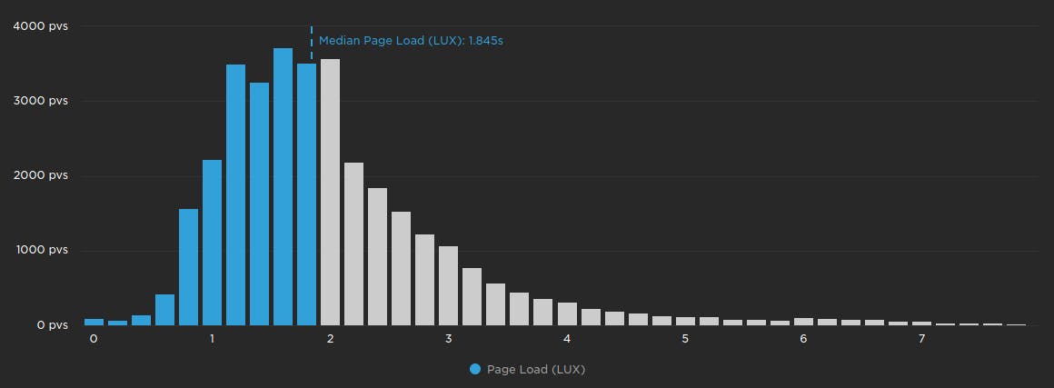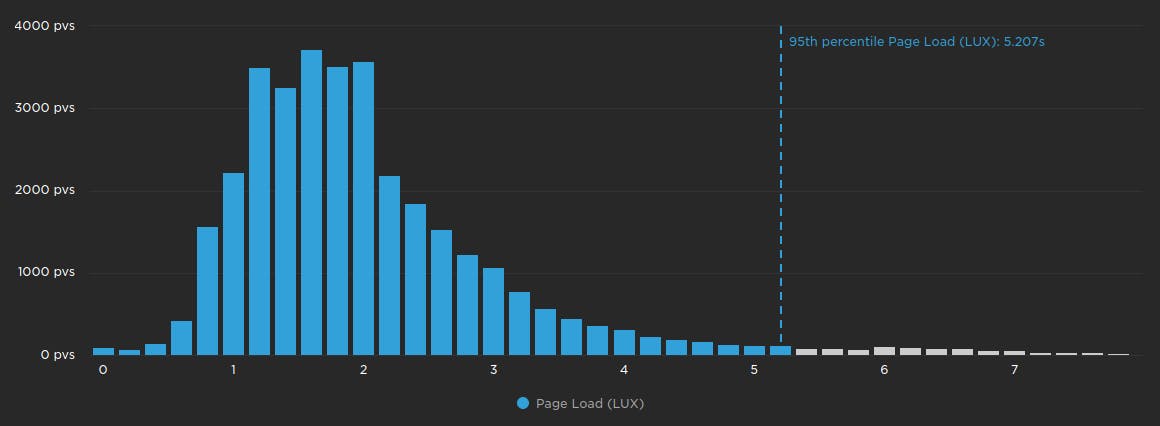 The chart above shows the page load histogram with all of the measurements below the 95th percentile coloured in blue.