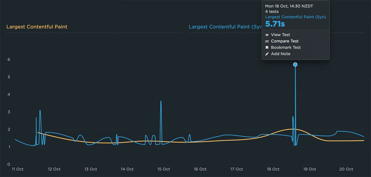 If you have both RUM and synthetic data, it can be helpful to plot both in the same chart. That way, if you get an alert on one of your RUM metrics, you can drill down into your synthetic test data, which is where your Lighthouse scores and audits live, along with your waterfall charts and other diagnostic information. For example, by adding synthetic test data to the same chart we looked at above, we can see that there's a spike in the LCP number for synthetic alongside the high LCP number in RUM: