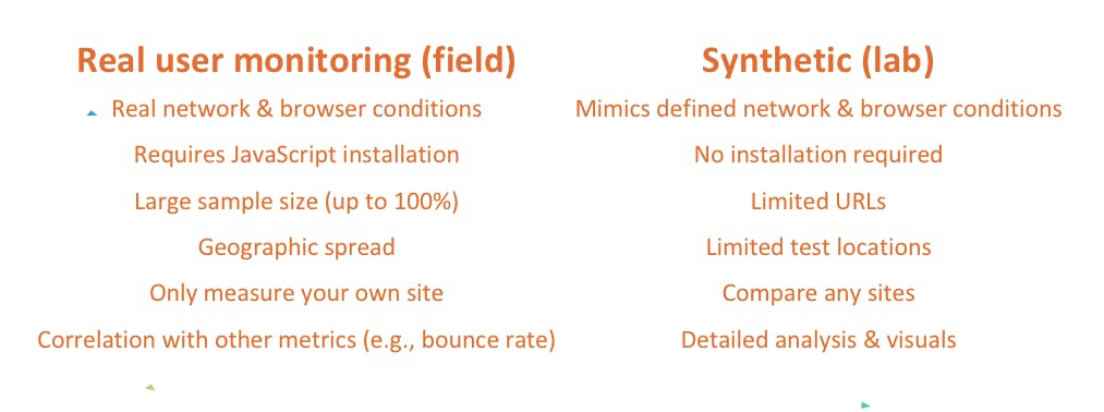 Synthetic monitoring (also called synthetic testing or lab testing) is conducted on servers in data centres using a throttled connection to try and mimic the conditions an average user might experience. Synthetic testing lets you establish baselines for your metrics and see the impact of code changes on your metrics.